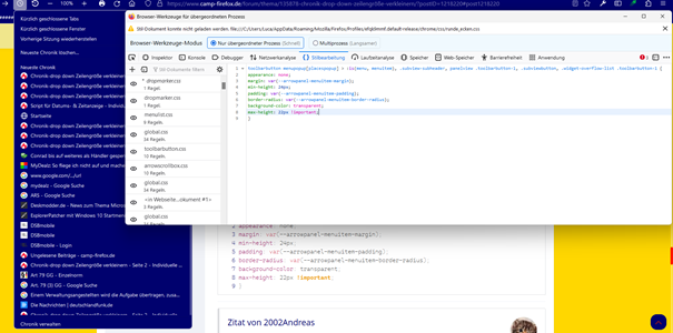 2002Andreas ich habe das jetzt mal mit vollständig auskommentierter userChrome.css direkt in der Stilbearbeitung getestet. Leider keine Funktion.
