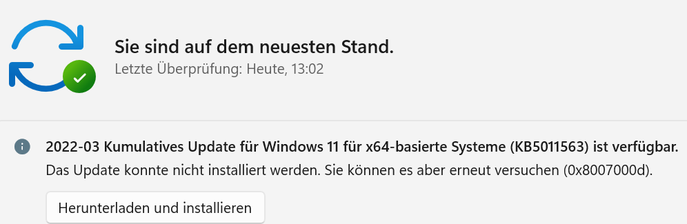Hatte heute Abend nochmals das Update 4/2022 geladen und wollte es installieren, es kommt dann diese Fehlermeldung (richtig ist, dass sich dieses Update (Kb2022-04 kumulatives Update für Windows 11 für x64-basierte Systeme (KB5012592) nicht installieren lässt, was allerdings nicht im Gegenzug heißt, dass das System nicht mehr korrekt funktioniert, da sollte man schon einen Unterschied machen. Das will ich auch hier nicht diskutieren oder breittreten, ich warte ab, was es an Tweaks demnächst gibt, dann sehe ich weiter. Seit Installation kann ich Windows 11 vollumfänglich nutzen, ohne Einschränkung, dieses eine Update ausgenommen.