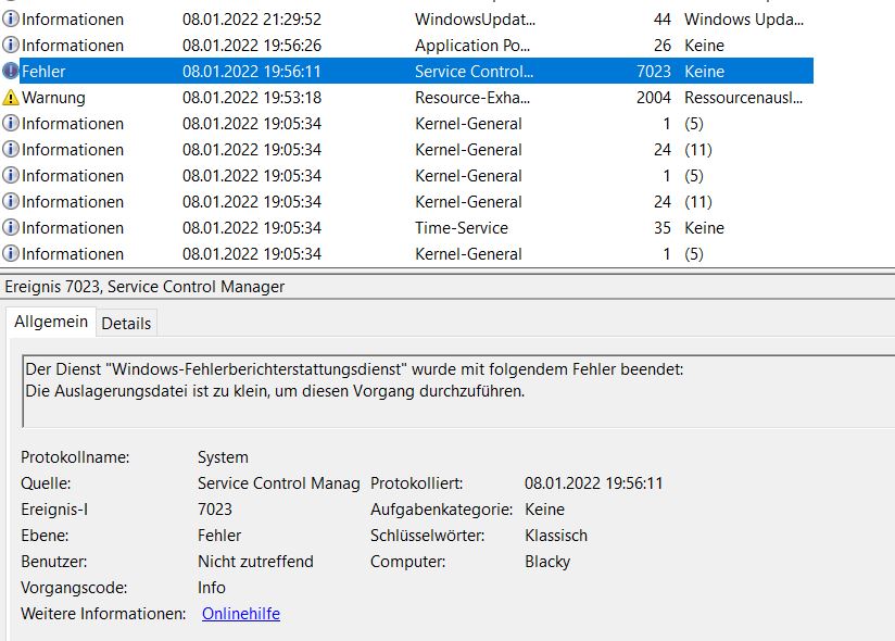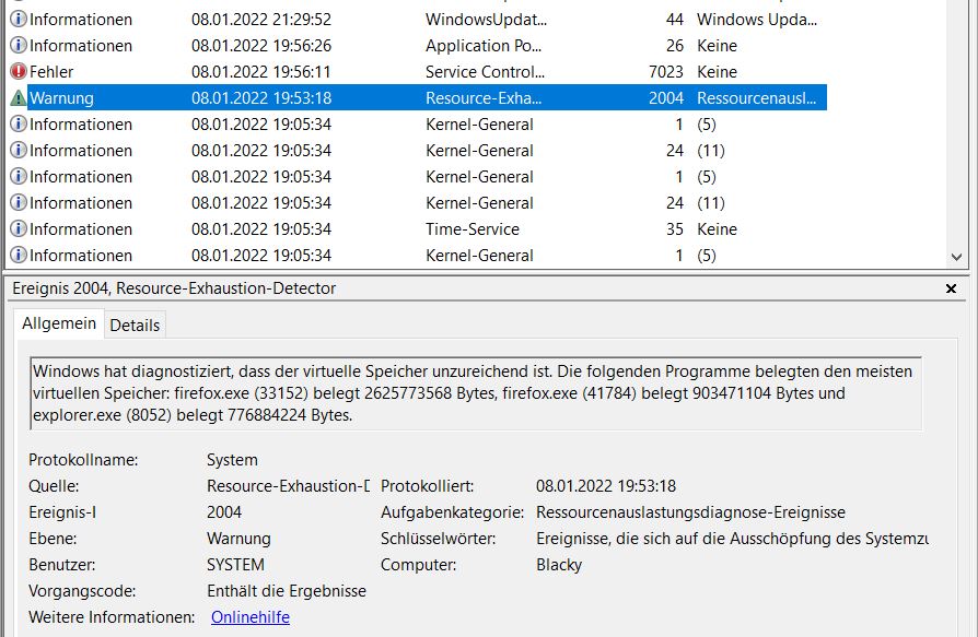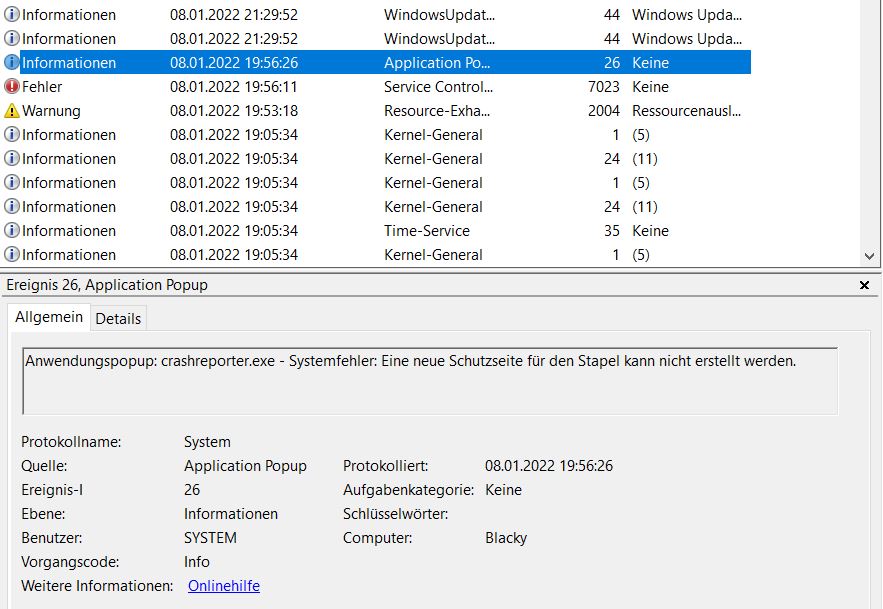 hier einige Meldungen, welche ich für Sinnvoll hielt. Diese sind kurz vor dem letzten Absturz erstellt. Ich habe die Auslagerungsdatei von 1-2 GB auf 2-20 GB erhöht.