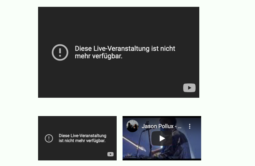 Ich habe ein Problem mit eingebetteten Youtube-Videos. Seit einiger Zeit kann man bei Youtube für zb neue Musikvideos eine Live-Premiere einrichten. Die Videos stehen ab dem Ende der Premiere bei Youtube als reguläre Videos zur Verfügung. Sind sie aber auf einer Webseite eingebettet, so scheint Firefox, installiert auf mac OS, diese Videos nicht als reguläre zu erkennen. Zu sehen auf dieser Webseite https://jasonpollux.de/ bzw in meinem Screenshot. Ich habe es mit Chrome versucht, da werden die Videos normal angezeigt. Die URL der Videos hat (für mich ersichtlich) keinen Unterschied zu "normalen" Videos, anders als zb Videos, die in Listen eingebettet sind.