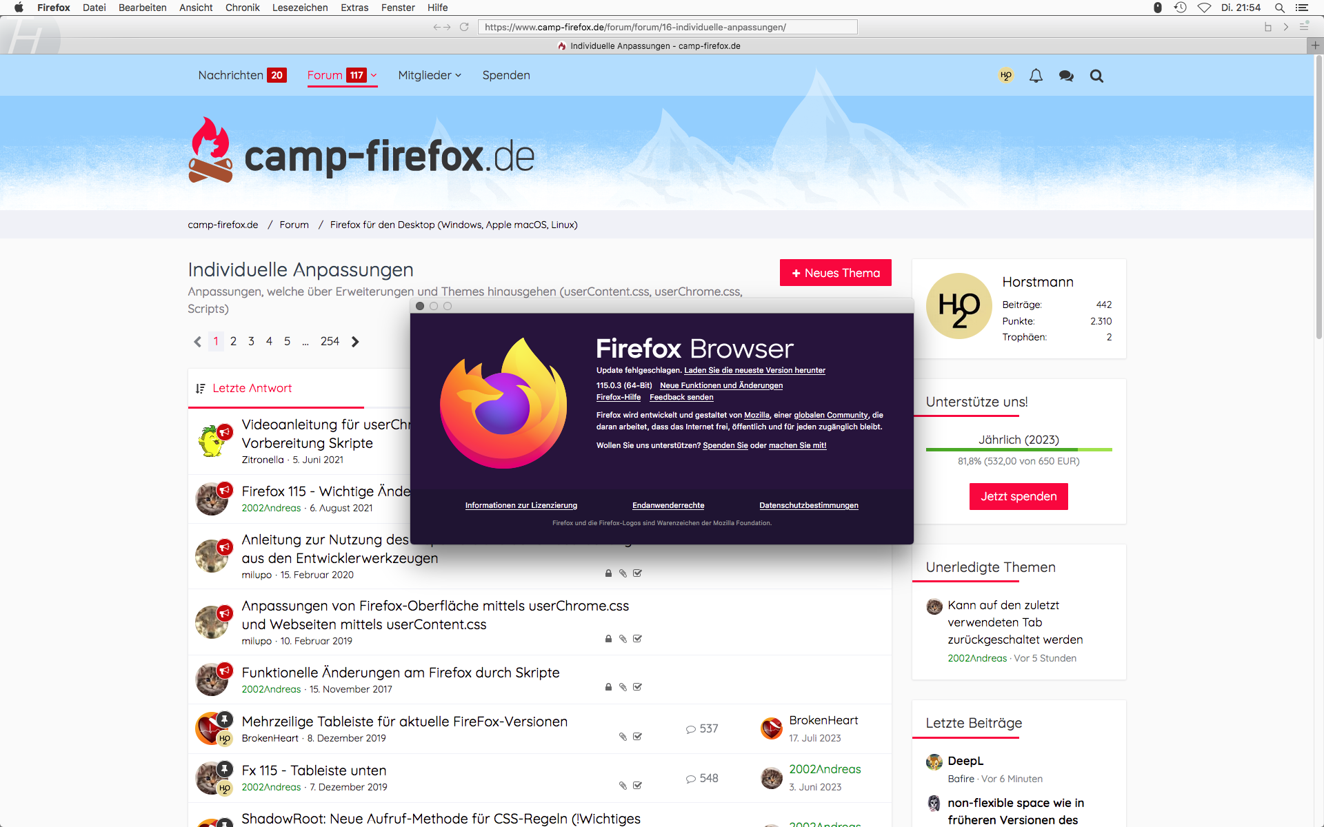 Das Update war angezeigt in Fx115.02 (in Über Firefox), dann war es plötzlich weg, und Firefox aktuell ; dann kam 115.03, die Updatetaste ist irgendwann wieder aufgetaucht, hat aber nicht funktioniert, schliesslich aber doch. ![]()