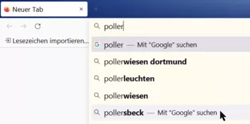 Nur ein Neuer Tab: Adresszeile Eingabe: kugelhaufen – Klick auf Google = Suche bleibt jetzt wieder mit dem Zusatz Google* stecken. Eine Return zeigt dann ein Tab mit Google Ergebnis an.