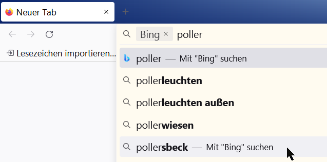 Nur ein Neuer Tab: Adresszeile Eingabe: kugelhaufen + Return = Ein Tab mit Ergebnis von duckduckgo