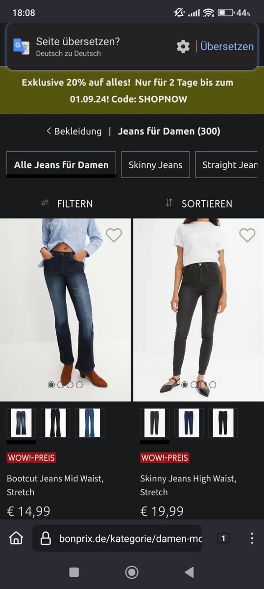 ich benötige und hoffe auf eure Hilfe, ich habe ein Problem mit dem Bonprix Onlineshop. Jedes Mal wenn ich den Shop aufrufe, werden mir die Produkte erst ganz normal angezeigt und sobald ich dann nach unten scrolle um mir die restlichen, in diesem Falle Jeans, anzuschauen, verschwindet alles und es wird mir dann nur noch der unterste Bereich der Seite mit den Zahlungsarten usw. angezeigt, aber alle Produkte sind weg. Habe es schon im Desktop Modus versucht, aber auch da geschieht beim runter scrollen das Gleiche. Ich habe auch schon meine Erweiterungen ausgeschaltet, weil ich dachte vielleicht liegt es am "Dark Reader", am "I don't care about cookies" und/oder am "uBlock Origin". Nicht hat geholfen, die Produkte verschwinden jedes Mal beim runter scrollen, hoffe man kann das auf meinen Screenshot erkennen.