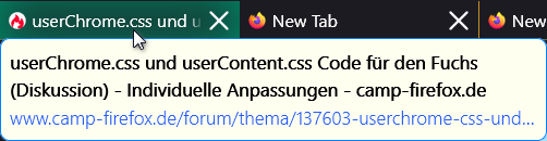 In diesem Thema können Sie Ihre Codes für userChrome.css und userContent.css austauschen oder diskutieren, wie sie funktionieren, ohne separate Themen zu erstellen. Das Beispiel stammt aus dem Thema userChrome.js Scripte für den Fuchs (Diskussion)