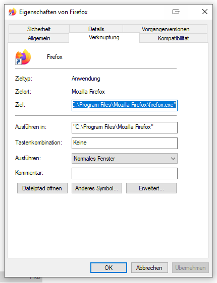 und das steht in der "Angehefteten Verknüpfung" die in der Taskleiste :