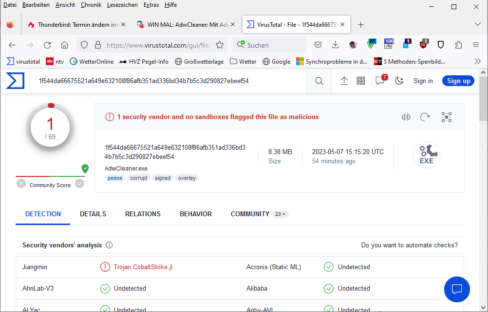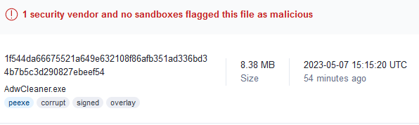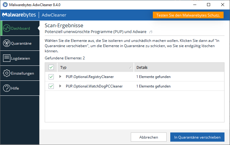 Alles anzeigen# ------------------------------- # Malwarebytes AdwCleaner 8.4.0.0 # ------------------------------- # Build: 08-30-2022 # Database: 2022-10-10.1 (Cloud) # Support: https://www.malwarebytes.com/support # # ------------------------------- # Mode: Scan # ------------------------------- # Start: 05-07-2023 # Duration: 00:00:22 # OS: Windows 10 (Build 19045.2846) # Scanned: 32058 # Detected: 2 ***** [ Services ] ***** No malicious services found. ***** [ Folders ] ***** PUP.Optional.RegistryCleaner C:\ProgramData\Microsoft\Windows\Start Menu\Programs\Registry Cleaner PUP.Optional.WatchDogPCCleaner C:\ProgramData\PC Cleaner ***** [ Files ] ***** No malicious files found. ***** [ DLL ] ***** No malicious DLLs found. ***** [ WMI ] ***** No malicious WMI found. ***** [ Shortcuts ] ***** No malicious shortcuts found. ***** [ Tasks ] ***** No malicious tasks found. ***** [ Registry ] ***** No malicious registry entries found. ***** [ Chromium (and derivatives) ] ***** No malicious Chromium entries found. ***** [ Chromium URLs ] ***** No malicious Chromium URLs found. ***** [ Firefox (and derivatives) ] ***** No malicious Firefox entries found. ***** [ Firefox URLs ] ***** No malicious Firefox URLs found. ***** [ Hosts File Entries ] ***** No malicious hosts file entries found. ***** [ Preinstalled Software ] ***** No Preinstalled Software found. AdwCleaner[S00].txt - [4579 octets] - [05/02/2021 19:23:36] AdwCleaner[C00].txt - [4361 octets] - [05/02/2021 19:26:46] AdwCleaner[S01].txt - [1667 octets] - [06/02/2021 18:24:07] AdwCleaner[S02].txt - [1728 octets] - [07/02/2021 13:49:22] AdwCleaner[S03].txt - [1789 octets] - [02/05/2021 11:56:36] AdwCleaner[S04].txt - [1913 octets] - [14/09/2021 11:02:59] AdwCleaner[C04].txt - [2076 octets] - [14/09/2021 11:06:55] AdwCleaner[S05].txt - [1909 octets] - [26/10/2021 14:03:09] AdwCleaner[S06].txt - [2642 octets] - [03/04/2022 18:01:36] AdwCleaner[C06].txt - [2868 octets] - [03/04/2022 18:05:59] ########## EOF - C:\AdwCleaner\Logs\AdwCleaner[S07].txt ##########