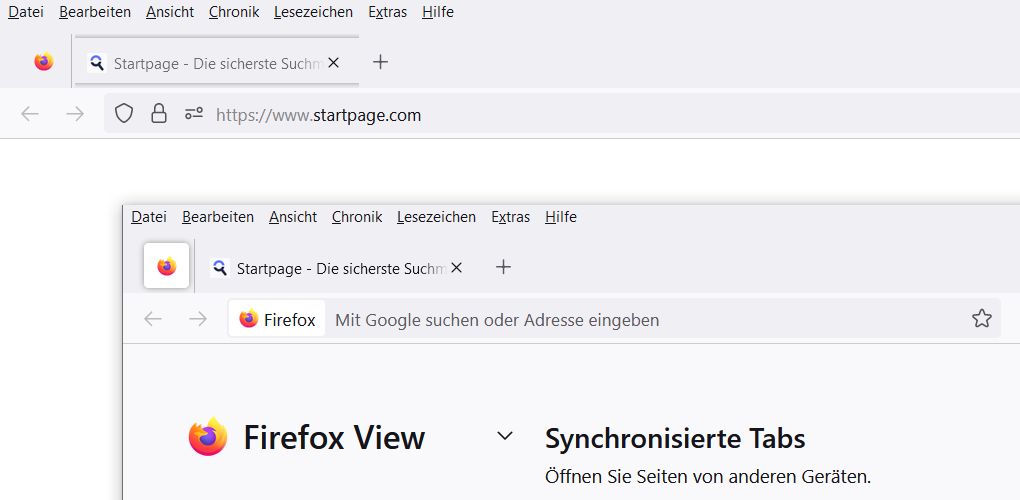 Anbei ein Screenshot von den Tabs. Einmal Firefox View und einmal Normal, in einem Bild.