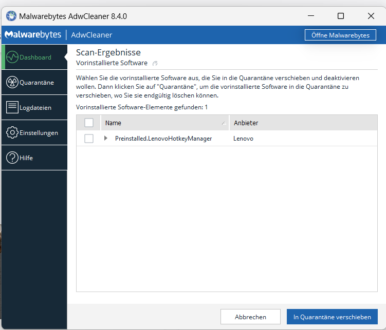 Danach bitte erneut Malwarebytes durchlaufen lassen und uns den Log geben