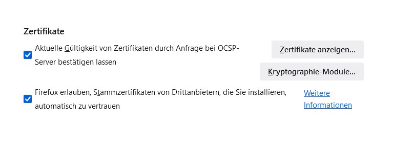 an, mit dem Inhalt pref("security.enterprise_roots.enabled", true, locked);