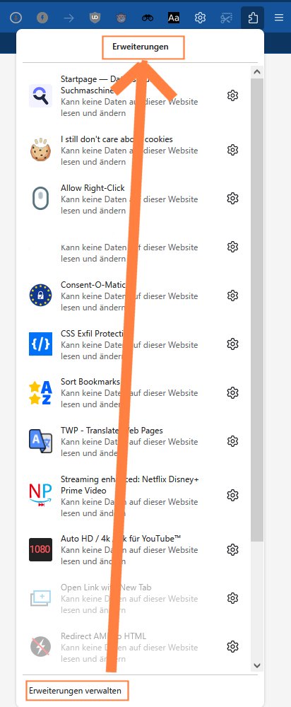 mich stört mehr und mehr, dass ich, sobald ich die Add-On-Übersicht (Dropdownmenu) aus der Menubar starte, ganz nach unten scrollen muss, um mit "Erweiterungen verwalten" die Add-On-Verwaltungsseite aufrufen zu können. Ganz oben steht sinn- und funktionsfreierweise nur "Erweiterungen", was aber klar ist, wenn man bewusst den Menubarbutton drückt. Ich hätte jetzt gerne "Erweiterungen verwalten" dort oben, wo "Erweiterungen" steht. Das "Erweiterungen" kann gerne da stehen bleiben, ich möchte nur nicht mehr für "Erweiterungen verwalten" ganz nach unten scrollen müssen. Lässt sich das mit CSS oder Skript verwirklichen?