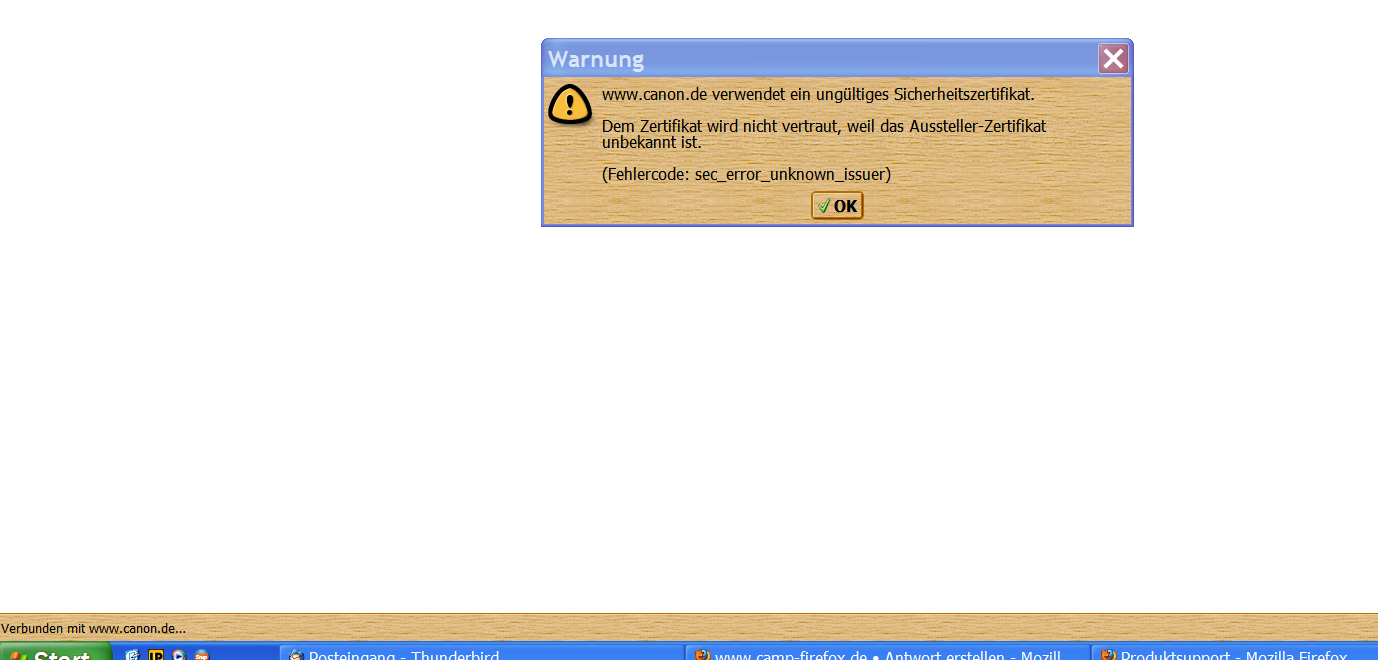 neuerdings erhalte ich bei Aufrufen der Adresse "http://www.canon.de/Support" (nur beim Support!!) die Warnung:"http://www.canon.de verwendet ein ungültiges Sicherheitszertifikat. Dem Zertifikat wird nicht vertraut, weil das Aussteller-Zertifikat unbekannt ist." Ich habe Canon angemailt und folgende Antwort erhalten: Wir haben den Sachverhalt geprüft. Dabei konnten wir keine Unregelmäßigkeiten an unserem System feststellen. Um den Fehler zu beheben, installieren Sie bitte die aktuelle Version 3.5.1 des Browsers Mozilla Firefox.