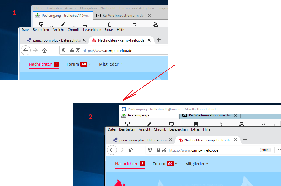 auf dem Screenshot "2" - ist ein Ausschnitt vom Thunderbird-Fenster oben mit einer eckigen Ecke und darunter ein Firefox-Fenster - auch mit einer runden Eckte