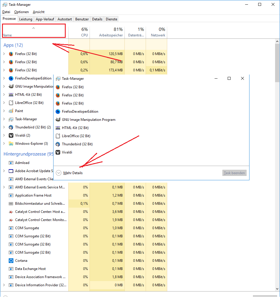 um Mehr im Taskmanager zu sehen, klickst du auf "Mehr Details" und dann in der ersten Spalte oben auf "Name".