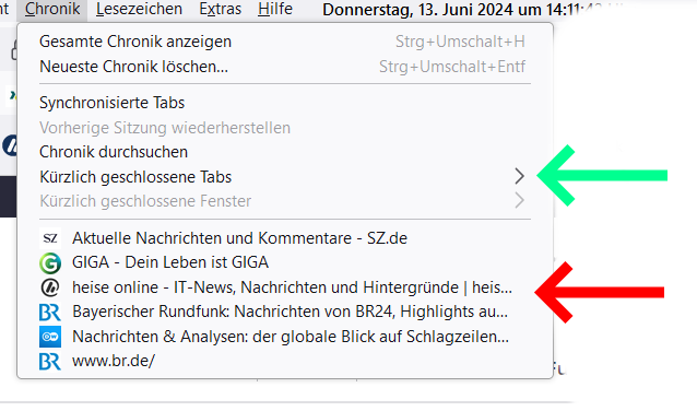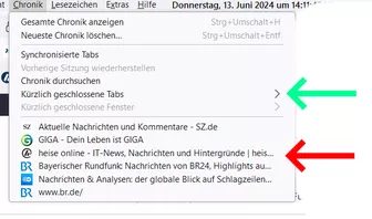 Aus dem Unterpunkt "Kürzlich geschlossene Tabs" (grün markiert) öffnet sich der Link in einem neuen Tab. Aus der, wie ich es nenne, Schnellansicht (roter Pfeil) wird der aktuelle Tab überschrieben. Und ich habe immer aus dieser Schnellansicht geöffnet, weil man da ja schneller den versehentlich geschlossenen Tab (mein häufigster Fehler) gleich sieht.