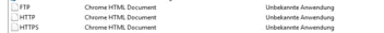 Hatte gehofft, durch die Deinstallation von Chrome würde sich das Thema erledigen. Fehlanzeige. In der Zwischenzeit habe ich angefangen, die Dateitypen manuell zuzuordnen. Das geht, jedoch nicht bei den Protokollen. Hier wird immer noch Chrome angezeigt (siehe Anhang), anders als bei den Dateitypen gibt es hier jedoch kein anderes Programm zur Auswahl.