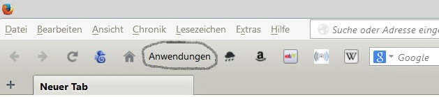 ich benutze seit Jahren External Application Buttons um Links zu Webseiten direkt anzeigen und aufrufen zu können. Seit Firefox 29 funktioniert das aber nur noch unvollkommen. Das Add-on und die dann erstellten Buttons werden zwar in der Symbolleiste angezeigt, es wird aber auch die Bearbeitungsmaske (Anwendungen - im Bild schwarz umrandet) angezeigt, die eigentlich nur im Bearbeitungsmodus sichtbar sein sollte und beim Beenden des Bearbeitundmodus verschwinden müßte. Das tut sie aber nicht!