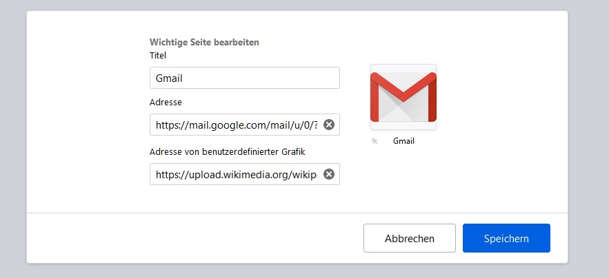 Durch Mouseover über eine der "wichtigen Seiten" auf der "Neuer Tab"-Seite erscheinen drei Punkte rechts oben, hier "Bearbeiten" auswählen, dann kann man Titel, Bild und URL der jeweiligen Seite anpassen.