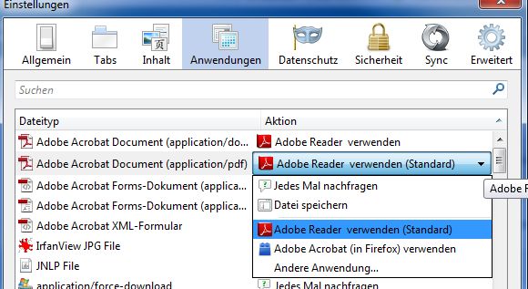 Schalter pdfjs.disabled auf true, Vorwahl auf Adobe im FF verwenden