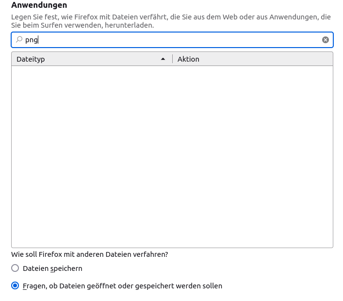 Wenn ich ein PNG-Bild oder eine PDF in FF öffnen möchte, geht das nicht mehr, die Option im Dialog ist ausgegraut.