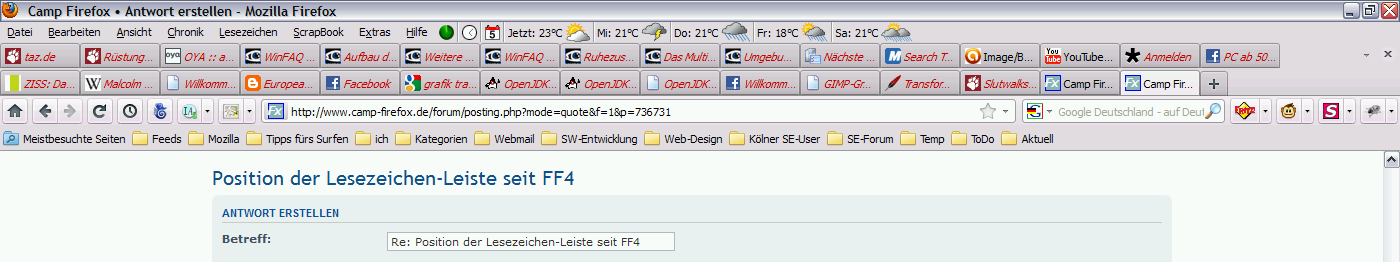 Stimmt, kann man machen.Ja, viele viele Antworten, doch immer noch keine Lösung ...und für Boersenfergers fehlende Lesezeichensymbolleiste gibt's auch keine Erklärung, außer daß er sie vermutlich deaktiviert und/oder nicht belegt hat.