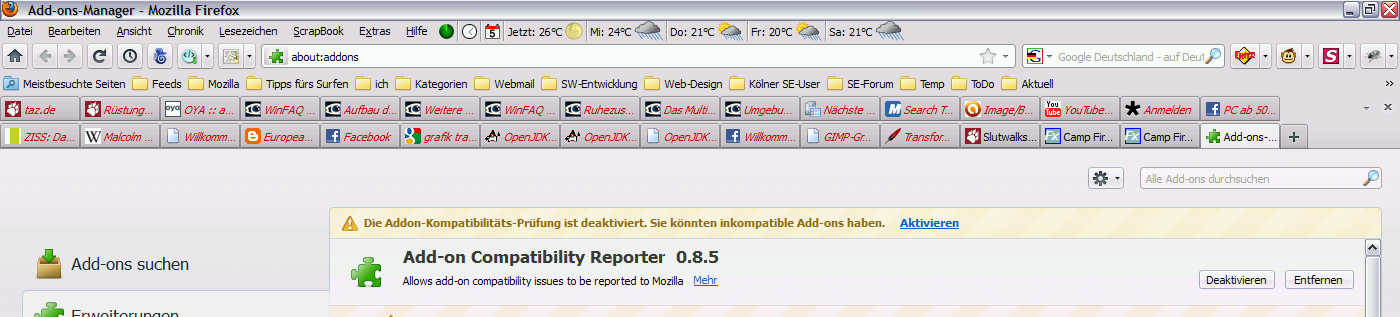 Seit dem ist der FF nicht mehr zu gebrauchen, die vorherige Sitzung ist weg, und unter dem Sitzungsmenu auch nicht mehr zu finden. Unter Extras->Addons sehe ich nur punkte im Kreis tanzen ohne Änderung in Sicht. -