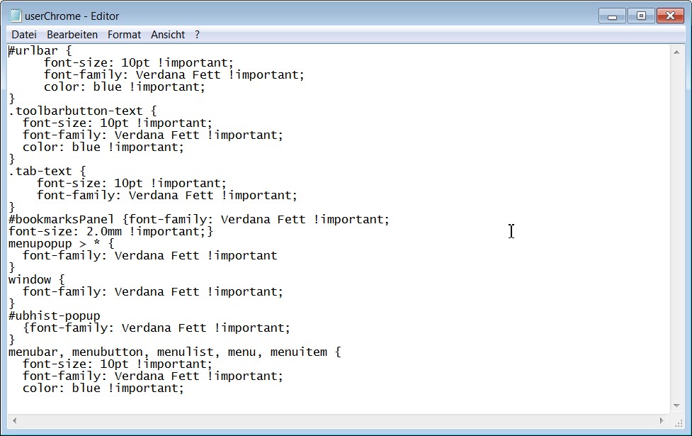 Meistens werden auf einer Webseite mehrere verschiedene Schriftgrößen verwendet, überwiegend zu kleine. Es ist sehr lästig, jedesmal per Strg + die gewünschte Vergrößerung herbeizuführen. Möglicherweise hängt es damit zusammen, daß in meinem gespeicherten Profil/Chrome/usercrome seit "altersher" Veränderungen bezüglich toolbar, urlbar etc. gespeichert sind, die jetzt mit übernommen worden sind. Details sh. Anhang.