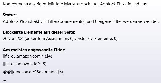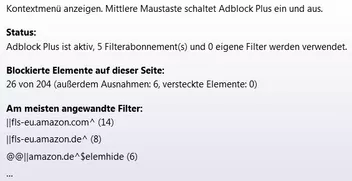 Wenn ich auf der Amazon-Seite bin und den Mauszeiger über das ABP-"Stoppschild" bewege, erscheint dieses Fenster: