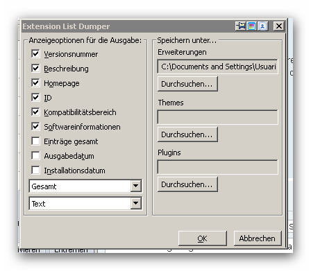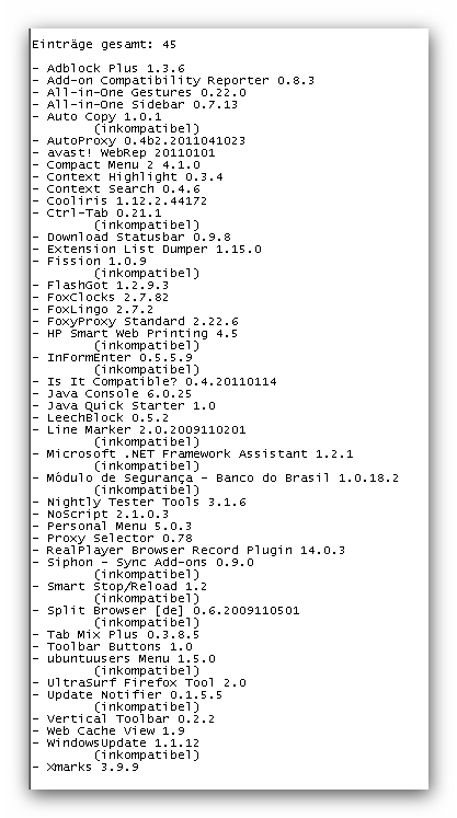 Ich habe mich gefragt ob man das nicht einfacher machen könnte und gesucht ob man nicht eine Liste mit dem Installationsdatum der Erweiterungen erstellen kann um die zuletzt installierten zuerst zu testen. Nachdem ich nichts gefunden habe suchte ich bei Mozilla. Mit der Erweiterung "Extension List Dumper" glaubte ich das richtige gefunden zu haben. (Siehe Screenshot). Es kommt aber keine Ausgabe.