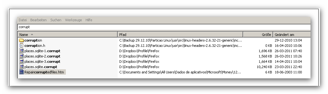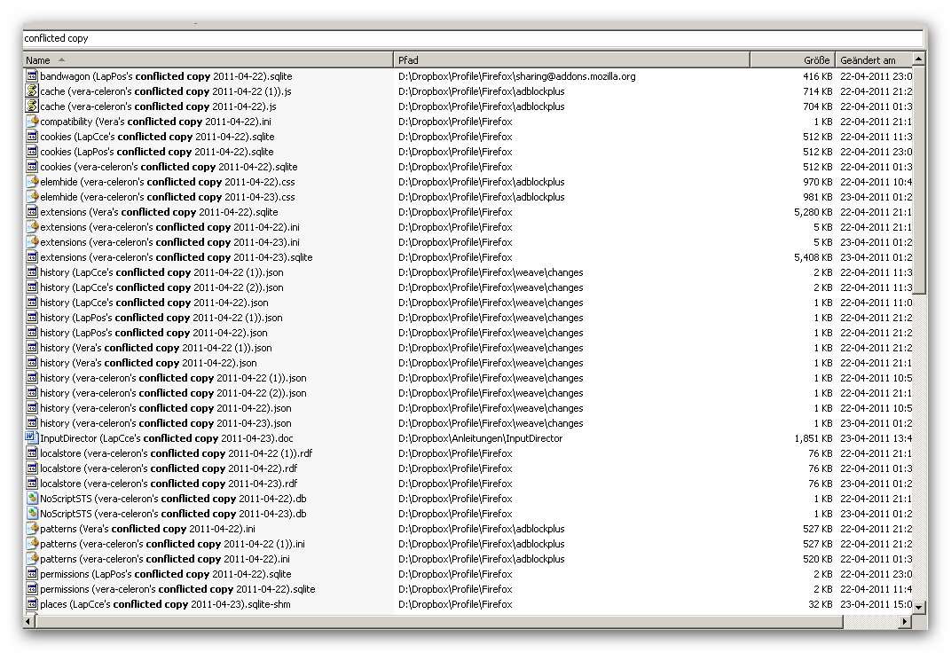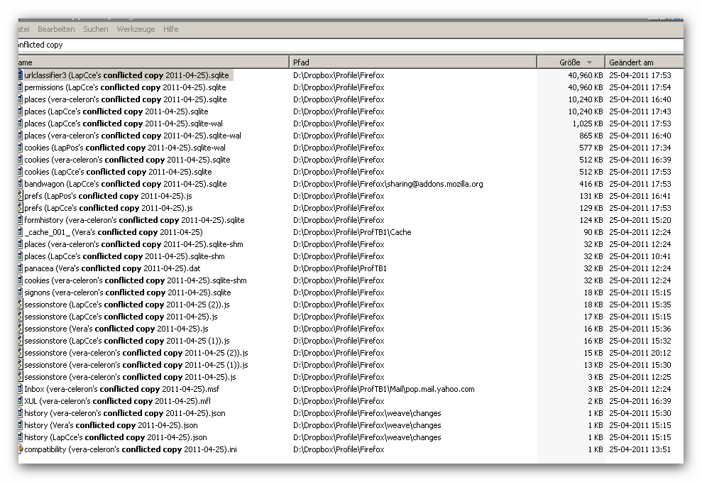 Ich habe in MyDropbox eine sehr grosse Menge von Dateien “conflicted Copy” und auch manche „corrupt“. Nachdem ich nur allein an meinen PCs arbeite und nie zur gleichen Zeit kann ich mir nicht vorstellen warum dies geschieht. Besonders ist es von Firefox (flashgot, localstore, permissions, places usw.).