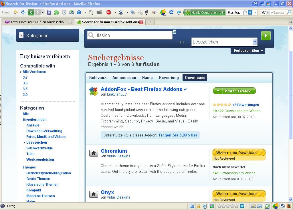 Beispiel: Suchbegriff ist "fission", als Suchergebnis werden aber 3 ganz andere Add-ons angezeigt: