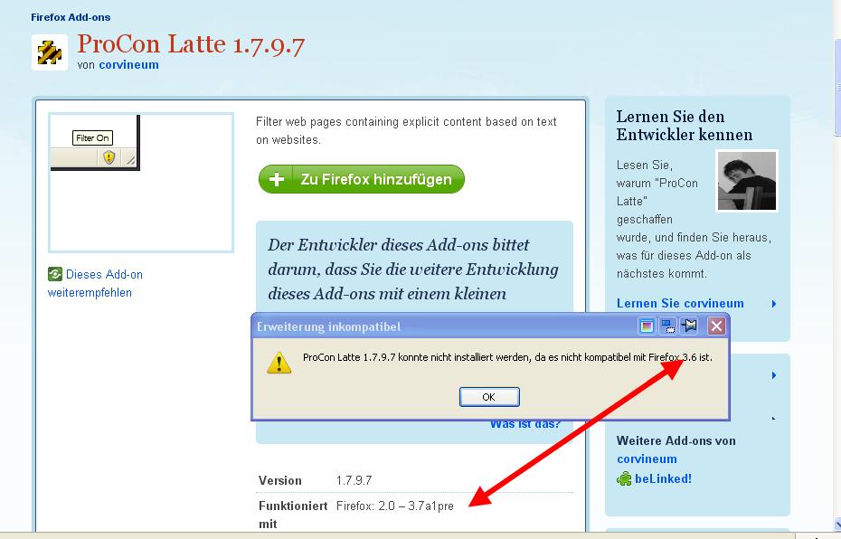 Ich habe manchmal Erweiterungen die mit der aktuellen FF Versiom 3.6 als kompatibel angezeigt werden. Sie lassen sich aber nicht installieren. Beispiel heute: ProConLatte.
