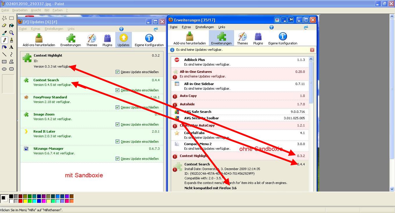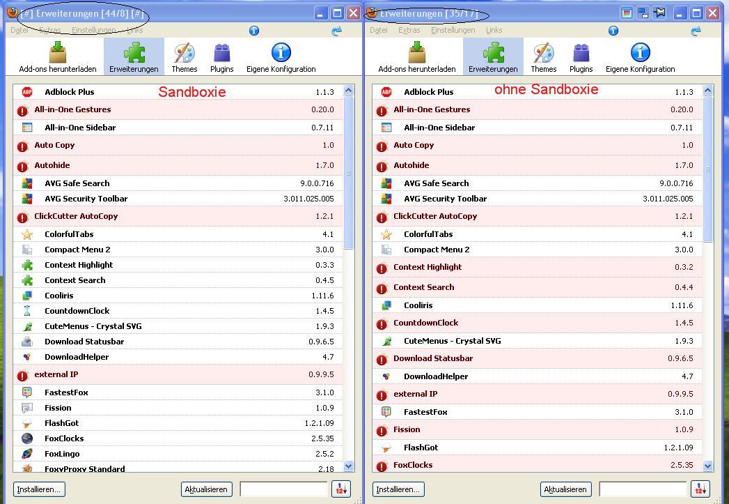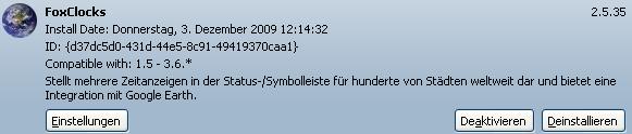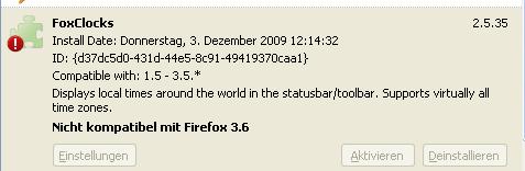 Sobald ich ausserhalb Sandboxie bin ist Foxclocks aber nicht mehr kompartibel. Im Erweiterungen-Manager werden in beiden Fällen die gleichen Daten (Installationsdatum und -Zeit und ID-Nummer) angezeigt. Unterschiede bestehen aber in der Kompatibilität: 1) 1.5 - 3.6.* bzw. 2) 1.5 - 3.5.* und "Nicht kompatibel mit Firefox 3.6".