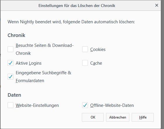Mir ist aufgefallen, dass seit heute mit der aktuellen Nightly die automatische Anmeldung bei mir nicht mehr funktioniert. Ich habe Nightly schon bereinigt und ein ganz frisches Profil erstellt. Danach habe ich in den Cookieeinstellungen die Ausnahmen für ver-