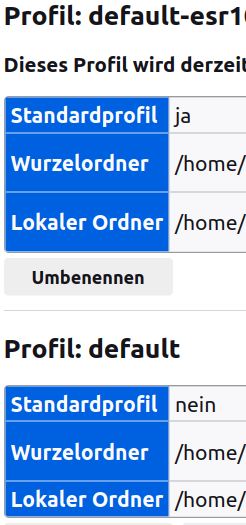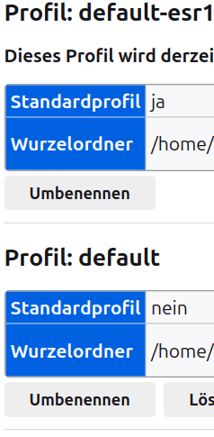 Die beiden offenen Fragen stellen sich auch, wenn es gar nicht um die gemeinsame Nutzung geht, sondern (erstens) wenn ein neues Profil angelegt wird und (zweitens) Firefox ESR unter Ubuntu vorgegeben werden soll, bei Installation und Nutzung nicht auf ~/.mozilla/firefox-esr/ und ~/.cache/firefox-esr/ zuzugreifen, sondern auf ~/.mozilla/firefox/ und ~/.cache/firefox/. Allein um darum geht es. Wie von Dir vorgeschlagen, habe ich in about:config nachgesehen, aber dort finde ich nichts, was auf die Möglichkeit einer Anpassung hinweist.