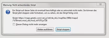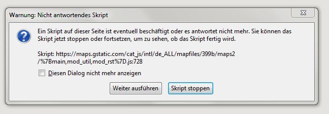 Und egal ob ich dann auf ´Weiter ausführen´ oder ´Skript stoppen´ klicke FF hängt sich kurz auf und dann schließt man am besten Google Maps und öffnet es neu sonst ist kein richtiges Arbeiten mehr möglich.