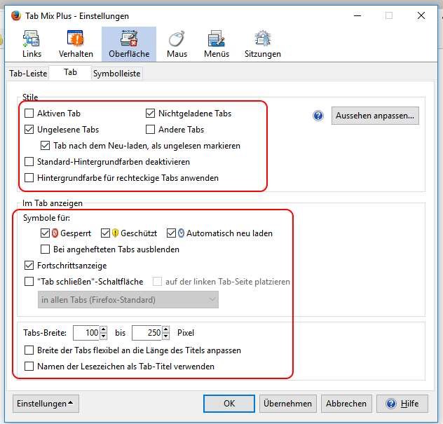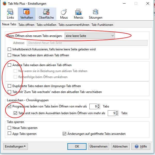 So, nachdem ich divers Addons und Scripte installiert habe, habe ich vor allem noch ein Problem. Neue Tabs werden nicht im Hintergrund geöffnet. Ich möchte/muss aber auf der aktuellen Seite bleiben, wenn ein neuer Tab für eine neue Seite geöffnet wird. Gibt es daür eine funktionierende Lösung? Außerdem wird manchmal beim Öffnen einer neuen Seite, der aktuelle Tab ans Ende verschoben und die neue Seite an dessen Stelle angezeigt. Und manchmal wird die neue Seite auch einfach rechts vom aktuellen Tab geöffnet und nicht rechts außen. Das passiert vor allem bei Seiten aus der Adressleiste, aber manchmal auch bei Links aus der Lesezeichen-Symbolleiste. Ich vermute, dass sich hier die Scripte und Addons gegenseitig Beine stellen.