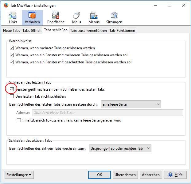 Was auch noch nicht funktioniert: Wenn der letzte Tab geschlossen wird, wird FF beendet. Es soll dann aber ein leerer Tab offen bleiben ode meinetwegen auch dieser komische neue Tab, bei dem ich schon alle Haken in den Einstellungen entfernt habe.