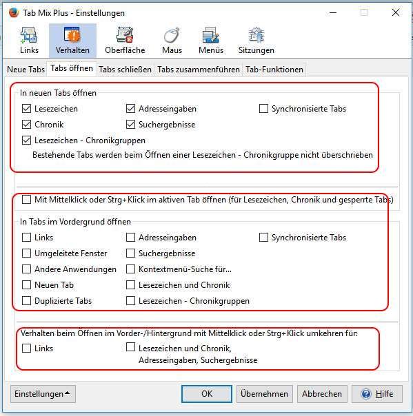 Außerdem habe ich habe alles, was Änderungen mittels about:config betrifft in die user.js geschrieben. Man weiß ja nie, was beim nächsten Update passiert.Es gibt da aber noch 2 große Problem. Links aus der Chronik werden im aktuellen Tab geöffnet. Links aus der Adressleiste und Links auf Webseiten, die einen neuen Tab öffnen (<a href="..." target="_blank">...</a>) werden direkt rechts neben dem aktuellen Tab geöffnet und erhalten beim Öffnen den Fokus. Aber auch diese Tabs sollen ganz rechts außen und im Hintergrund geöffnet werden.