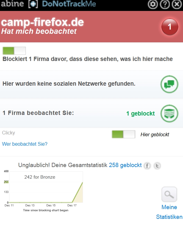 Dieses AddOn soll ja Tracking Cookies blocken. Hier auf der Seite Camp Firefox wird auch was geblockt, und zwar: