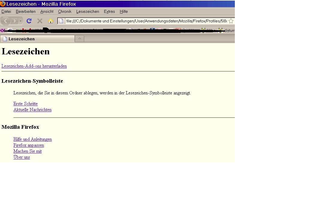 @ pencil, danke für den Link . Das müßte ich mir über den Firmenrechner (an dem ich jetzt bin ) runterladen. Nicht so gut. Mir würde es schon reichen ich könnte wieder alle Bookmarks sehen wenn ich die Bookmarkdatei anklicke.
