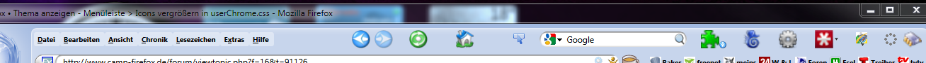 Es geht um FF5, ich schiebe mir gern die Buttons dahin wo Platz ist, nur jetzt sind mir die Buttons/Icons zu klein und ich würde sie gern vegrößern. Im FF3.6 waren sie an der Stelle schön groß, nach den Upgrades bis 5.0 hatte sich daran nichts geändert. Erst als ich den doofen Haken für kleine Symbole im Anpassen-Fenster mal aktivierte, wurden sie sehr klein und ließen sich nicht mehr überreden wieder schön groß zu werden.