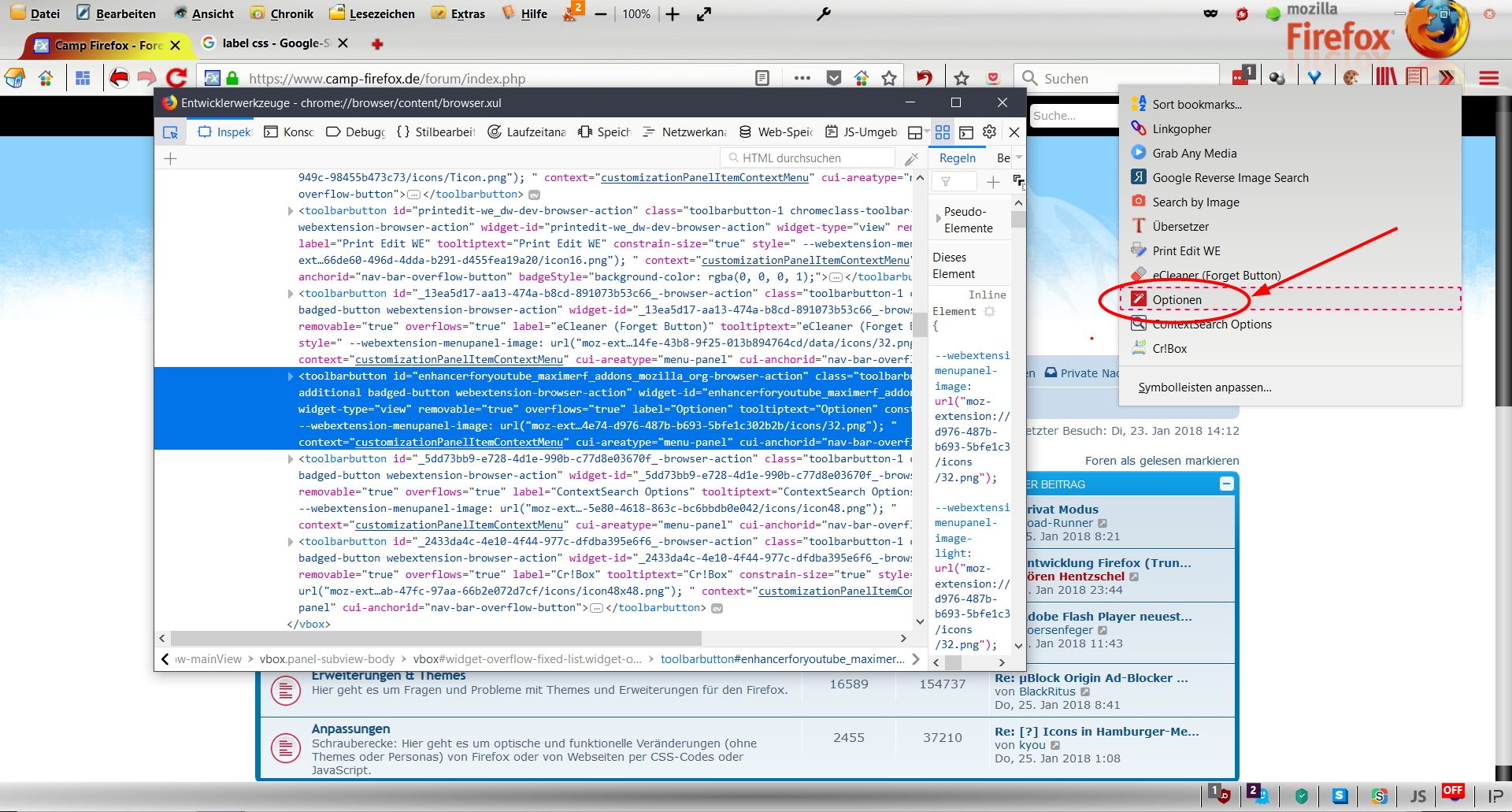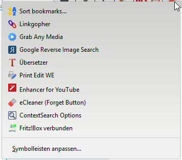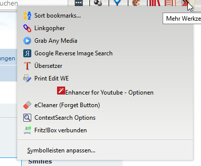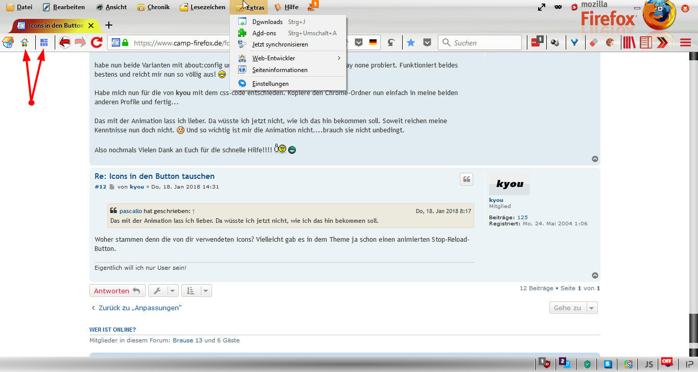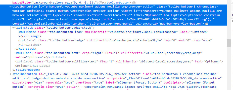 Nun meine Frage: Kann man die Icons von installierten Add-ons...wie z.B. FVD Speed Dial, Tile Tabs....usw.(siehe Beispiel-Pfeile im Bild) genauso anpassen? Wenn ja, wie kann man den die Identifier bzw. ID oder Namen dieser Buttons rausfinden?