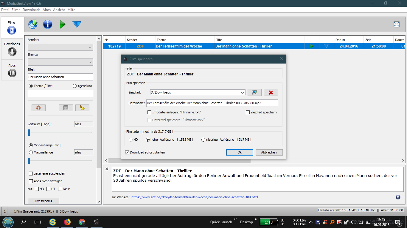 Da ich es schon mehrmals versucht habe, sind vom selben Film (der Mann ohne Schatten) sind mehrere Teildateien zu sehen, doch keine Datei hat die volle Filmlänge. Aiußerdem zeigt mir Netspeedmonitor keinen Download an.
