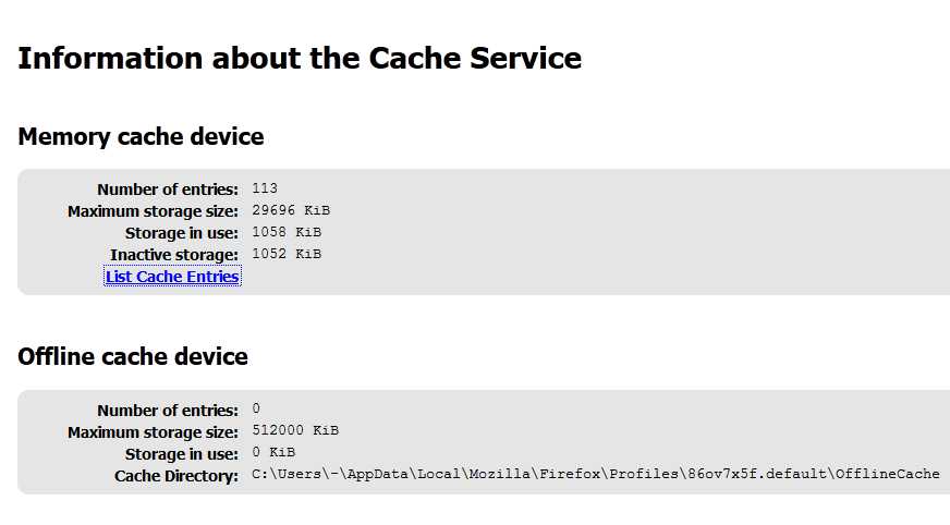 Ich habe auch hilfsweise ein Addon wie "CacheViewer Continued" installiert -- da kriege ich dann (nach entsprechender Surf-Dauer) jede Menge Dateien angezeigt, aber dieses Tool verrät mir nichts über den Ort, wo die abgelegt sind: Das (siehe oben) erzwungene Verzeichnis ist im Moment des Aufrufs des Viewer-Fensters ebenso leer von Cache-Einträgen wie das Profilverzeichnis