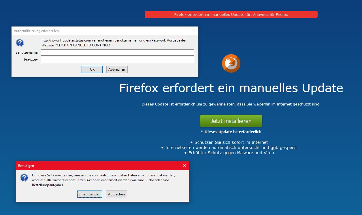 Weder kenne ich die URL ffupdaterstatus.com noch ist mir bekannt, dass Firefox über ein eigenständiges Antivirus-Tool verfügt. Und selbstverständlich habe ich nicht vor, mich irgendwo einzuloggen, wenn ich nicht weiß, warum und wie und wohin mich das führt...