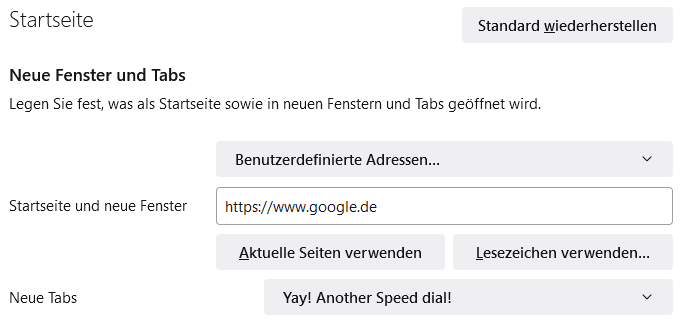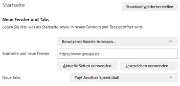 Jedes mal (auch wenn ich es umändere) überschreibt mir die Erw. "Yay! Another Speed Dial" die Aktion die ausgeführt wird, wenn ich einen neuen TAB öffne. Ich möchte "https://www.google.de" geöffnet haben, wenn ich einen neuen TAB öffne und nicht den DIALER.