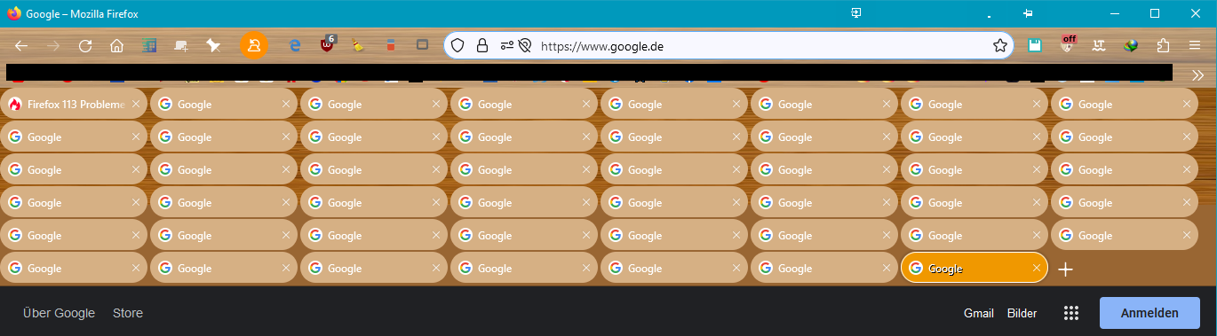Das Problem für mich ist jedoch, das dann aus unbekannten Gründen im FF119 dann meine Design der TABs gekillt wird. Es fehlt dann die Farben des markierten TAB und irgendwie sieht der neue TAB dann merkwürdig aus, weiß auch nicht wieso.