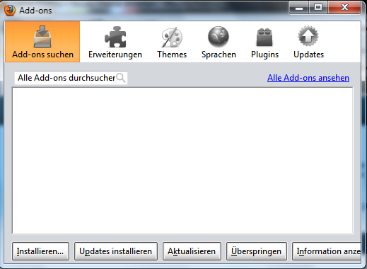 ich habe nach dem Windows Patch-Day gestern einen Neustart durchgeführt und danach festgestellt, dass das Übersichtsfenster unter Extas/Add-ons anders als vorher angezeigt wird (siehe Anhang), die installierten Addons, Themes und Plugins nicht mehr sichtbar sind und es nicht mehr möglich ist, die installierten Addons ect. zu aktualisieren. Das ist ja sehr seltsam. Wurde seitens FF daran etwas geändert?