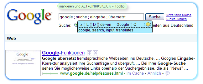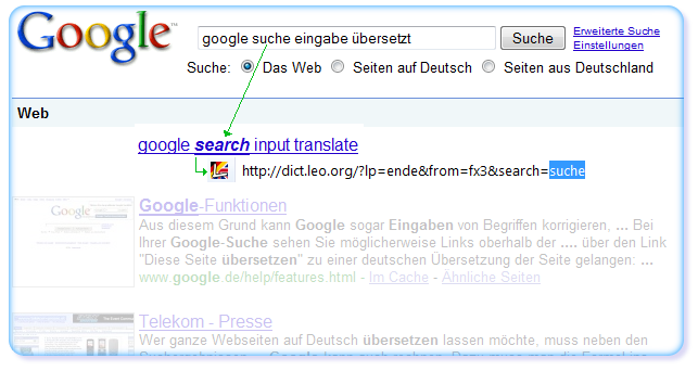 ist Dir eine Erweiterung bekannt, die Begriffe der Google- Suche automatisch übersetzt - und eine Verlinkung zu Loe.org anbietet?
